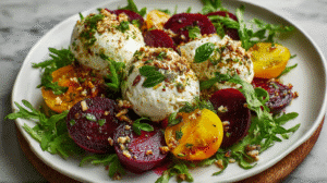 The Easy Roasted Beet and Burrata Salad Recipe combines vibrant colors, fresh citrus, and creamy burrata cheese to create a salad that’s as pleasing to the eyes as it is to the palate. Imagine the earthy sweetness of roasted beets, the soft richness of burrata, and the bright zest of oranges, all accented by crunchy pistachios and aromatic basil oil. This salad is perfect for effortless entertaining, a healthy lunch, or a stunning starter. With this recipe, you’ll learn not just how to assemble it, but the science behind roasting, flavor pairing, and achieving perfect texture every time.