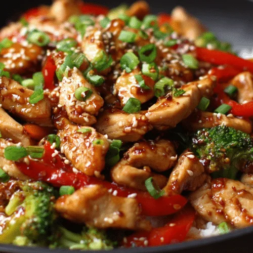 - In a small bowl, whisk together soy sauce, rice vinegar, honey, and cornstarch if using. Set aside.Heat 1 tsp olive oil in a large skillet or wok over high heat. Season chicken with salt and pepper. Add chicken and sear 3-4 minutes per side until cooked through. Remove from pan.Add remaining oil, garlic, and ginger to the pan. Sauté 30 seconds until fragrant. Add broccoli, bell peppers, snow peas, and carrots. Stir fry 3-4 minutes.Return chicken to the pan. Pour sauce over everything and stir 1-2 minutes until thickened and coated.Remove from heat. Garnish with green onions and sesame seeds. Serve over rice, quinoa, or enjoy as is.