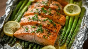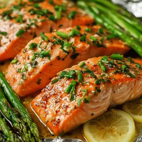 - Preheat oven to 400°F or 200°C and prepare four large foil sheets.Place asparagus in the center of each foil sheet and season lightly.Add salmon on top, then brush with olive oil and season with garlic, herbs, salt, and pepper.Drizzle lemon juice over salmon and top with lemon slices.Seal foil packets tightly and place on a baking sheet.Bake for 15 to 18 minutes until salmon flakes easily.Open carefully, garnish with herbs, and serve hot.