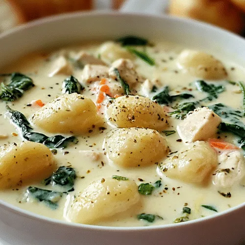 To make Creamy Olive Garden Chicken Gnocchi Soup, you’ll need simple, well-balanced ingredients. Use 2 tablespoons olive oil for sautéing. Add 1 medium yellow onion, finely diced, plus 2 stalks celery and 1 medium carrot, both chopped small for even cooking. Include 3 cloves garlic, minced, for bold aroma. You’ll need 1 pound (450 g) boneless, skinless chicken breasts, cut into bite-sized pieces. For the broth, measure 4 cups (960 ml) low-sodium chicken broth and 2 cups (480 ml) heavy cream. Add 1 pound (450 g) potato gnocchi, shelf-stable or fresh. Finish with 2 cups fresh spinach, 1 teaspoon Italian seasoning, salt, black pepper, and a pinch of nutmeg for warmth.