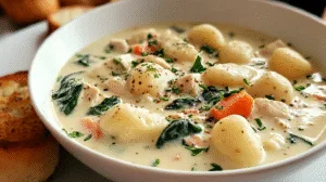 Store leftover Creamy Olive Garden Chicken Gnocchi Soup in an airtight container in the refrigerator for up to 3 days. Reheat gently on the stovetop over low heat, stirring often to maintain the creamy texture. Add a splash of broth or cream if it thickens too much. Serve this soup with warm breadsticks, crusty sourdough, or a simple green salad. For a restaurant-style presentation, garnish with grated Parmesan and cracked black pepper. This soup also pairs well with roasted vegetables or a light Caesar salad for a complete meal.