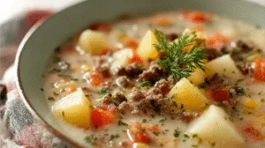 Warm, savory, and deeply comforting, Classic Ground Beef and Potato Soup is the kind of meal that fills your kitchen with rich, aromatic notes and makes everyone hover near the stove. Tender potatoes, hearty beef, and a creamy, well-seasoned broth come together to create a bowl that feels like home. This soup stands out because it balances rustic simplicity with bold flavor, making it perfect for busy weeknights or cozy weekends. In this guide to Classic Ground Beef and Potato Soup, you’ll learn how to build layers of flavor, choose the best ingredients, and create a satisfying soup your family will request again and again. You’ll learn…