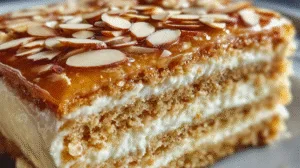 - Combine warm milk, sugar, and yeast; let sit 5–10 minutes.Mix flour and salt in a large bowl, add melted butter, egg, and yeast mixture. Knead 8–10 minutes until elastic. Let rise 1 hour.Preheat oven to 350°F (175°C). Grease a 9x13-inch pan. Spread dough evenly.Melt butter, sugar, honey, cream, and vanilla; stir in almonds and spread on dough.Bake 25–30 minutes until golden brown. Cool completely.Heat milk and half sugar until simmering. Whisk egg yolks, cornstarch, and remaining sugar; combine with hot milk. Return to heat until thickened, then add butter and vanilla. Cool.Slice cake horizontally; spread custard over bottom layer and place almond layer on top. Chill 2 hours before serving.