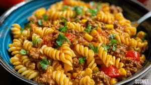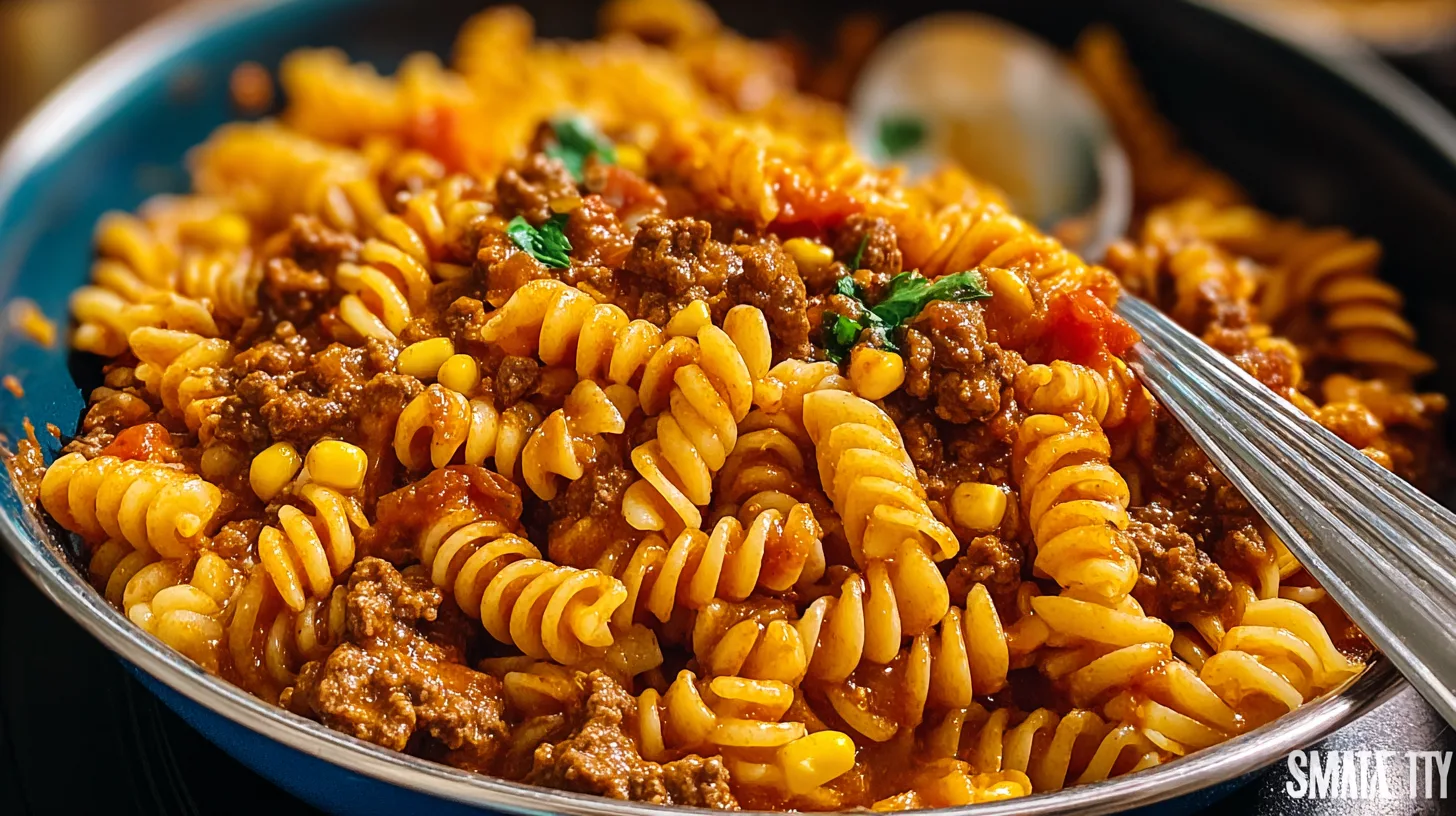 This recipe uses simple pantry staples with big payoff. You’ll need 1 pound (450 g) lean ground beef for richness without excess grease. Use 1 tablespoon olive oil to start the sauté. One medium yellow onion, finely diced, adds sweetness, while 3 cloves garlic, minced, bring aroma. Measure 2 tablespoons taco seasoning for classic flavor. Add 2 cups (480 ml) beef broth for depth and 1 cup (240 ml) canned crushed tomatoes for tang. Choose 10 ounces (280 g) dry short pasta like rotini or penne. Finish with 1 cup (120 g) shredded cheddar cheese and 1/2 cup (120 ml) heavy cream for a velvety sauce.