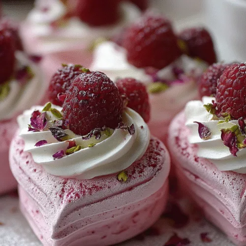 - Preheat oven to 225°F and line baking sheets with parchment paper.Whip egg whites until foamy, then gradually add sugar and beat until stiff and glossy.Fold in cornstarch, vinegar, vanilla, and gently swirl in roseberry puree and cocoa.Pipe or spoon meringue into heart shapes with a shallow center.Bake for 75 to 90 minutes, then cool completely in the oven.Whip cream with powdered sugar, assemble pavlovas with cream and berries, and serve immediately.